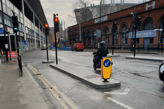 交通运输工程师Richard Butler和Jonathan Salter在大曼彻斯特休姆地区规划了首个CYCLOPS路口,用一条单独的环形车道,将自行车道与人行道、机动车道分离。自行车道通过向四面八方伸展的“手臂握紧”形成环形路线,并在交叉路口形成包围状,确保骑行者更安全地进行直行、左转、右转。环形路线能有效管理向四周延展,而不一定需要信号控制。通过环形车道的既定原则来管理循环冲突,被认为是最理想的方案。